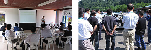 講習会では、エコドライブの必要性に関する講義を受け、その後いつもどおりの運転による燃費測定を行います。その後、エコドライブの具体的な方法について講義を受け、エコドライブ運転の練習をし、燃費を測定します。最後に、測定したデータを元に、エコドライブによって、どのくらい燃費が改善されたか等を、参加者それぞれ評価シートを元に確認し、インストラクターから講評を受けます。