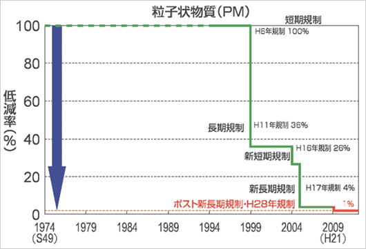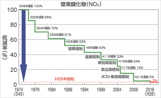 自動車排出ガス対策(単体規制) ホーム 低公害車について 自動車排出ガス対策(単体規制) 低公害車について 低公害車とは 低公害車指定制度とは 九都県市指定低公害車の指定 指定低公害車検索 指定低公害車一覧表 指定の手続き 自動車排出ガス対策(単体規制) 一都三県内の指定低公害車普及率 日本では、自動車個別の発生源対策として自動車排出ガスに含まれる大気汚染物質について、昭和48年から自動車1台ごとの排出規制を開始し、年々強化してきました。 自動車排出ガス規制の経緯(ディーゼル重量車) 出典:国土交通省