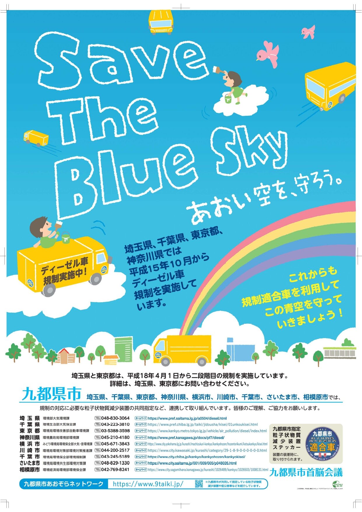 自動車排出ガスによる大気汚染を改善するため、九都県市(埼玉県、千葉県、東京都、神奈川県、横浜市、川崎市、千葉市、さいたま市、相模原市)では、一都三県の条例により、平成15年10月から粒子状物質の排出基準を満たさないディーゼル車の運行を禁止しています。 しかし、九都県市を走行する車の中には、いまだに排出基準を満たさないものもあることから、違反車をゼロにするための取組が重要となっています。 そこで、九都県市では、10月を強化月間と位置付け、条例に基づく車両検査を実施するとともに、サービスエリア等においてポスター掲示等による周知活動を行います。