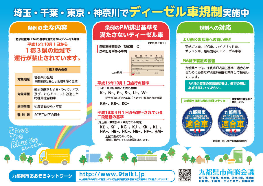埼玉県、千葉県、東京都、神奈川県の条例により、平成15年10月1日から、この全域において、ディーゼル車の排出ガス規制が実施されています。