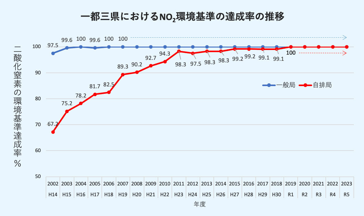 令和元年度においては、一都三県の全測定局でNO₂環境基準が達成されました。