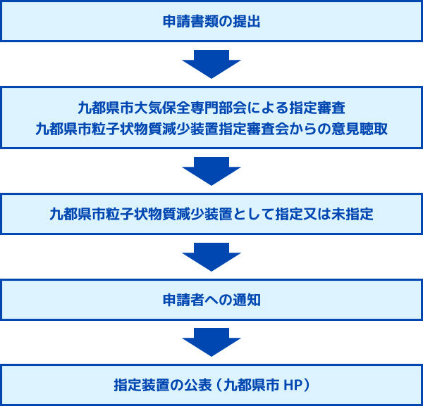 指定の手続き ホーム ディーゼル車規制・流入車対策について 指定の手続き ディーゼル車規制・流入車対策について 条例の主な内容 規制の対象型式 規制への対応 PM減少装置指定制度とは 指定装置一覧表 指定の手続き 九都県市のディーゼル車対策強化月間における取組 国の取組 ディーゼル車規制の効果 流入車対策について 粒子状物質減少装置の指定についてはPM指定要綱に基づき、以下の流れで指定しています。